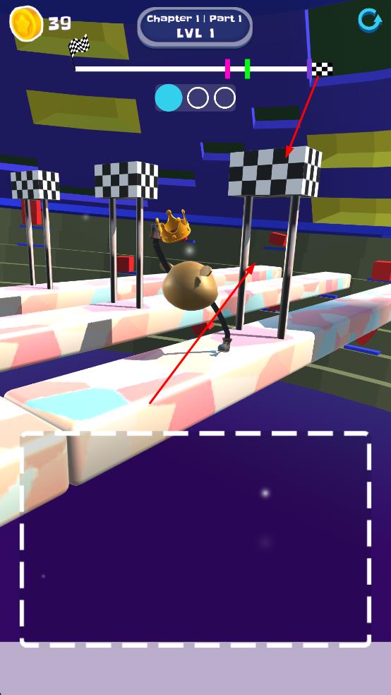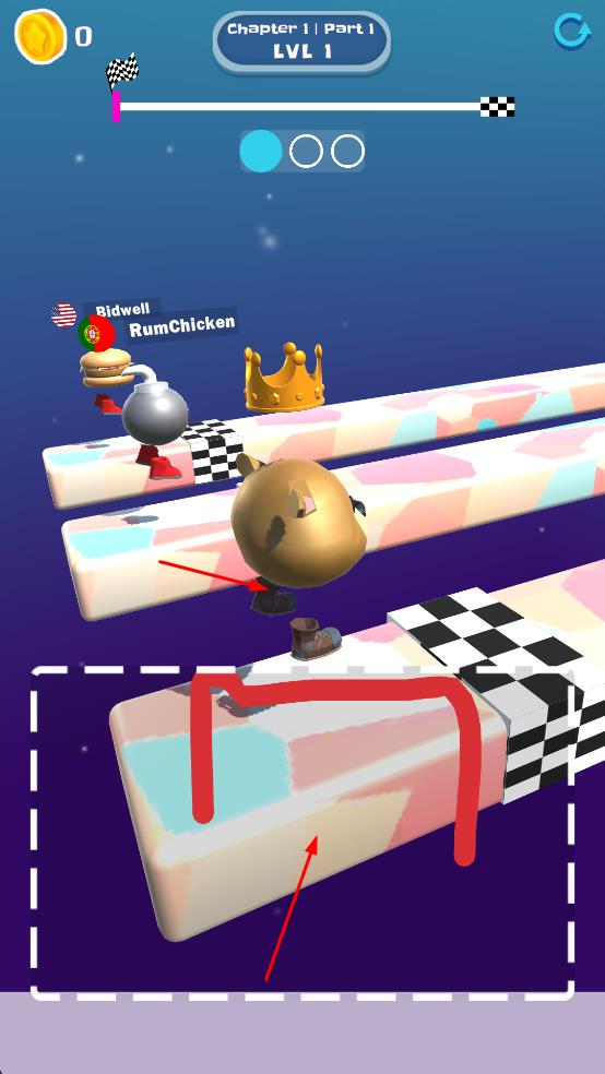 1、操控冲刺与绘画腿部:玩家先通过简单操作操控角色在赛场中向前冲刺,当角色出现停滞或需要调整方向时,需及时用指尖在屏幕上绘画腿部,根据当前赛道地形画出适配的形态。