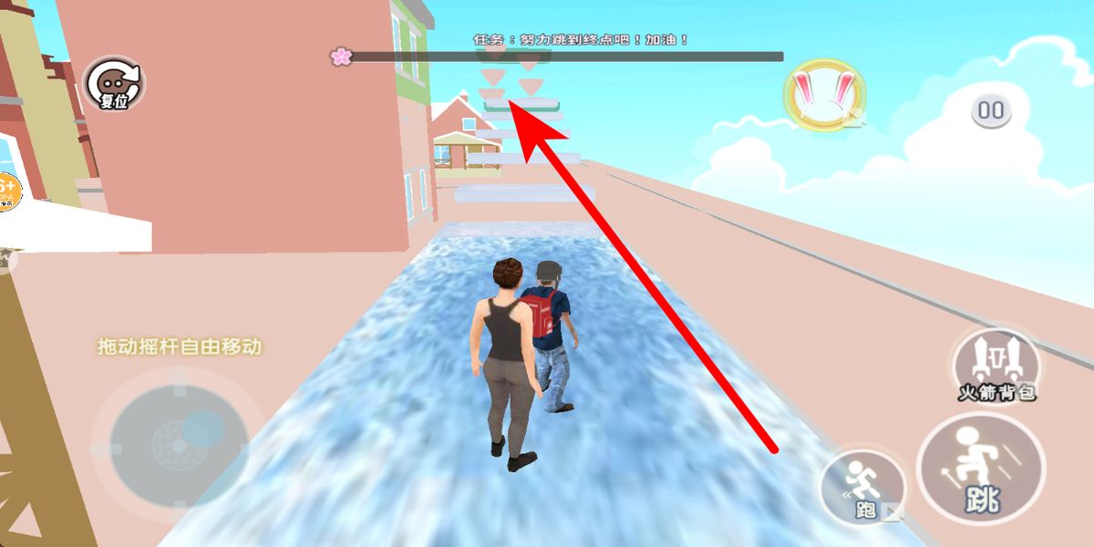 3、紧盯终点方向,留意场景道具如火箭背包,合理拾取助力跑酷,多次挑战熟悉障碍分布,调整跑跳时机,提升通关成功率。