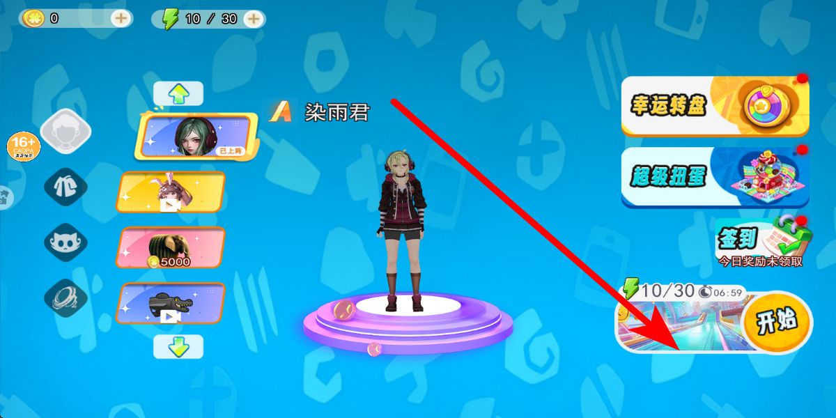 1、进入主界面,查看已解锁角色如染雨君,利用幸运转盘、超级扭蛋获取新角色或道具,选择双屏同行等模式,模式特点规划闯关策略。