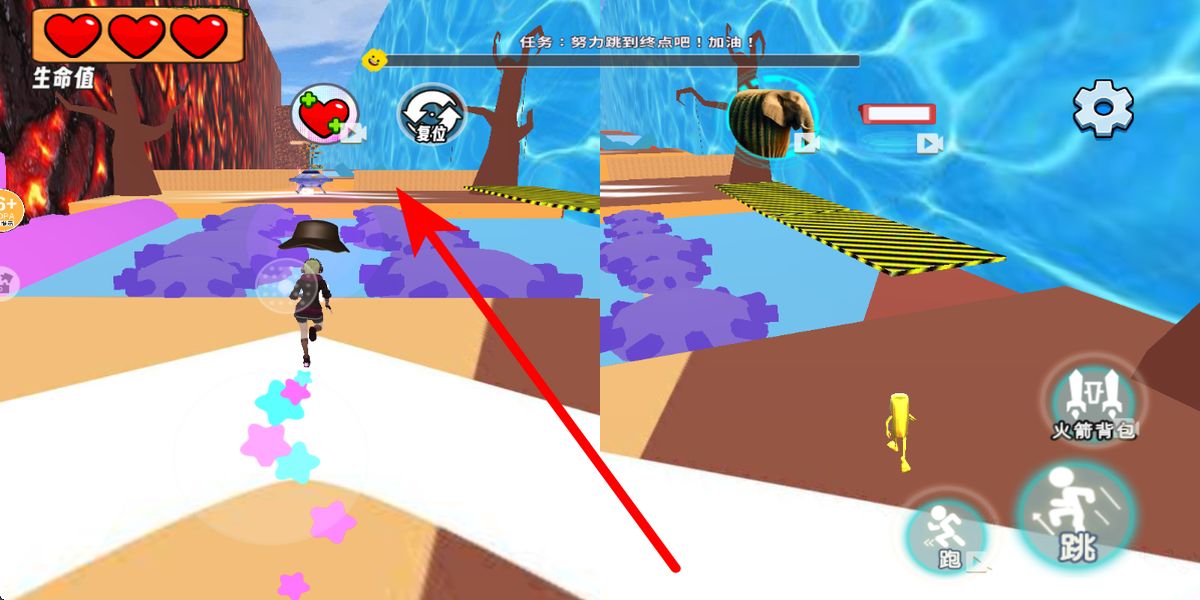2、开始关卡后,通过虚拟按键操控角色跑、跳,遇宽沟或高台把握时机跳跃,连续障碍需连贯操作,借助复位功能修正路线,避免掉落。