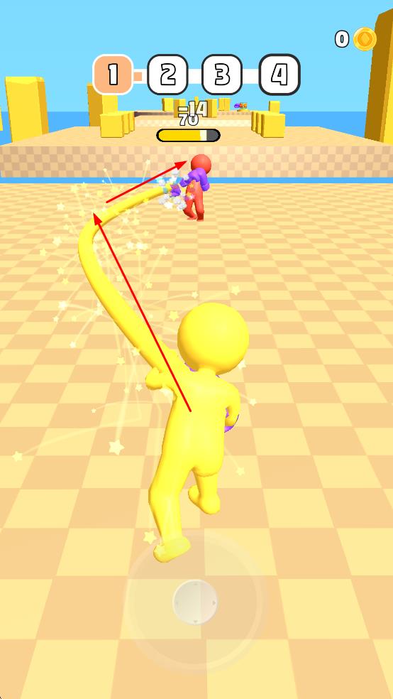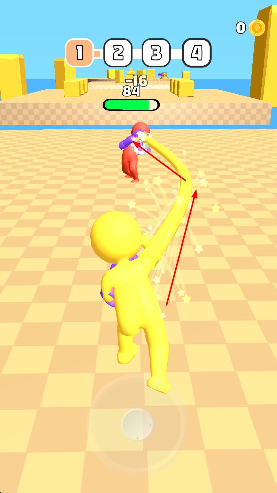 1、操控黄色橡皮人,伸长手臂攻击红色对手,消耗其血量,开启对战流程。