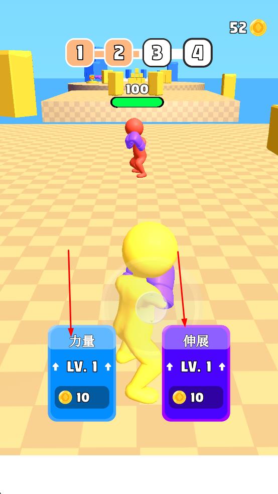 3、获胜后,消耗金币升级力量伸展属性,增强战斗能力。