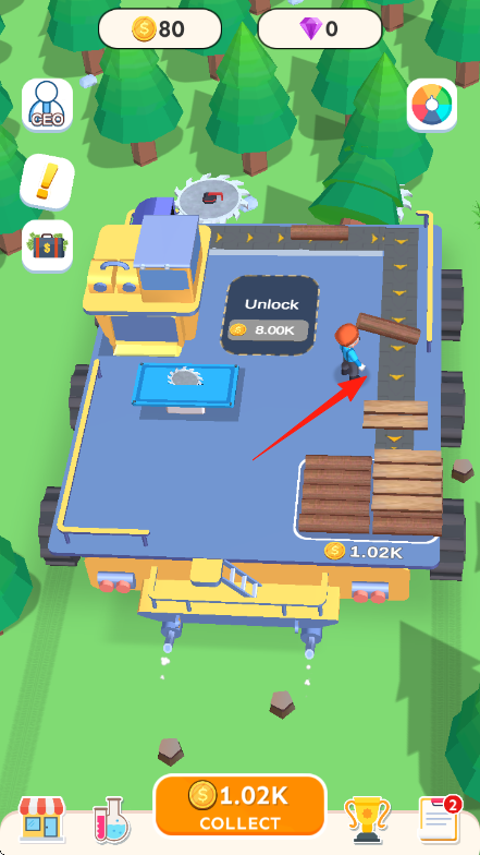 1、进入游戏,查看屏幕上方的金钱【$80】和钻石【0】数量,操控角色走向木板红箭头所指。