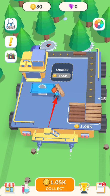 2、让角色搬运木板,放置到蓝色切割区域,切割木板获取金钱如【+15】,增加收入。