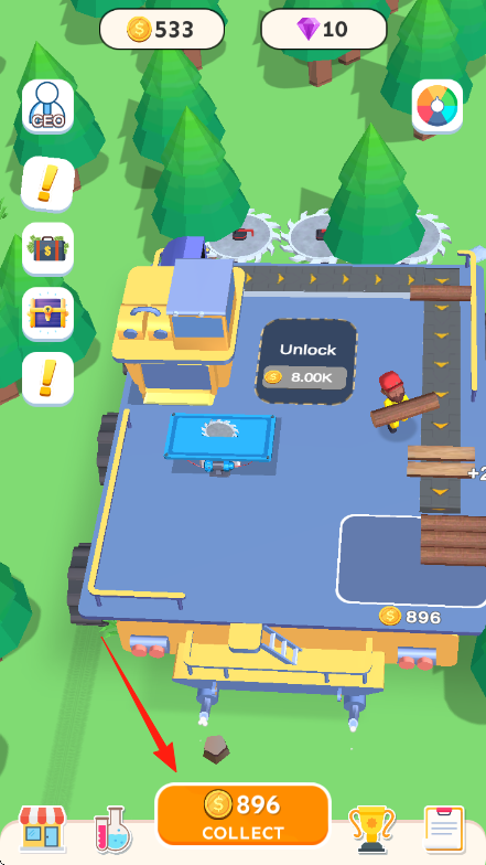 3、积累一定金钱后,点击屏幕下方的【COLLECT】收集金钱,利用资金解锁新区域或升级设备,推进游戏进程。
