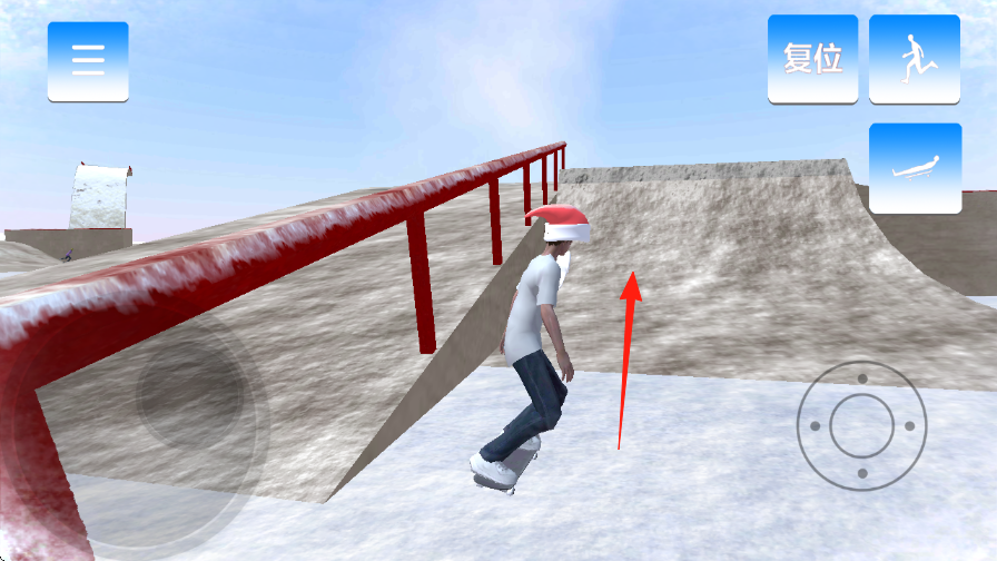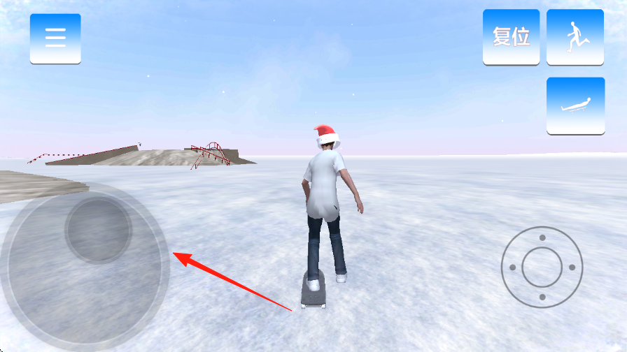 1、进入游戏,通过左下角虚拟摇杆红箭头所指操控角色在滑板上移动,前往前方的滑板场地。