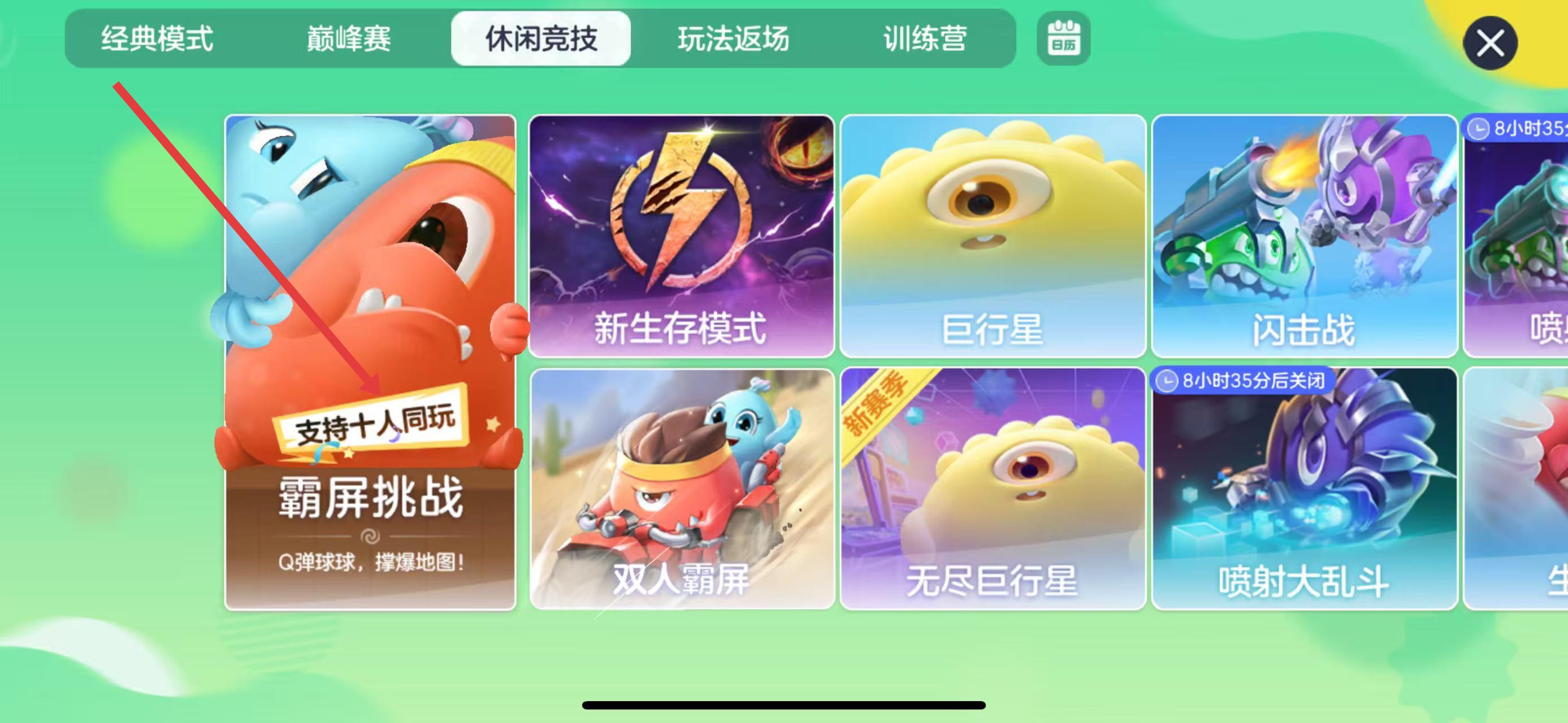 1、打开球球大作战进入主界面,点击极速团战旁切换按钮,选择休闲竞技,找到霸屏挑战模式进入。