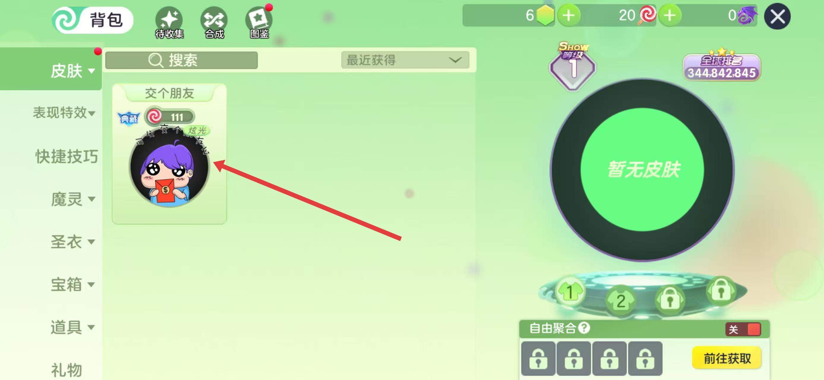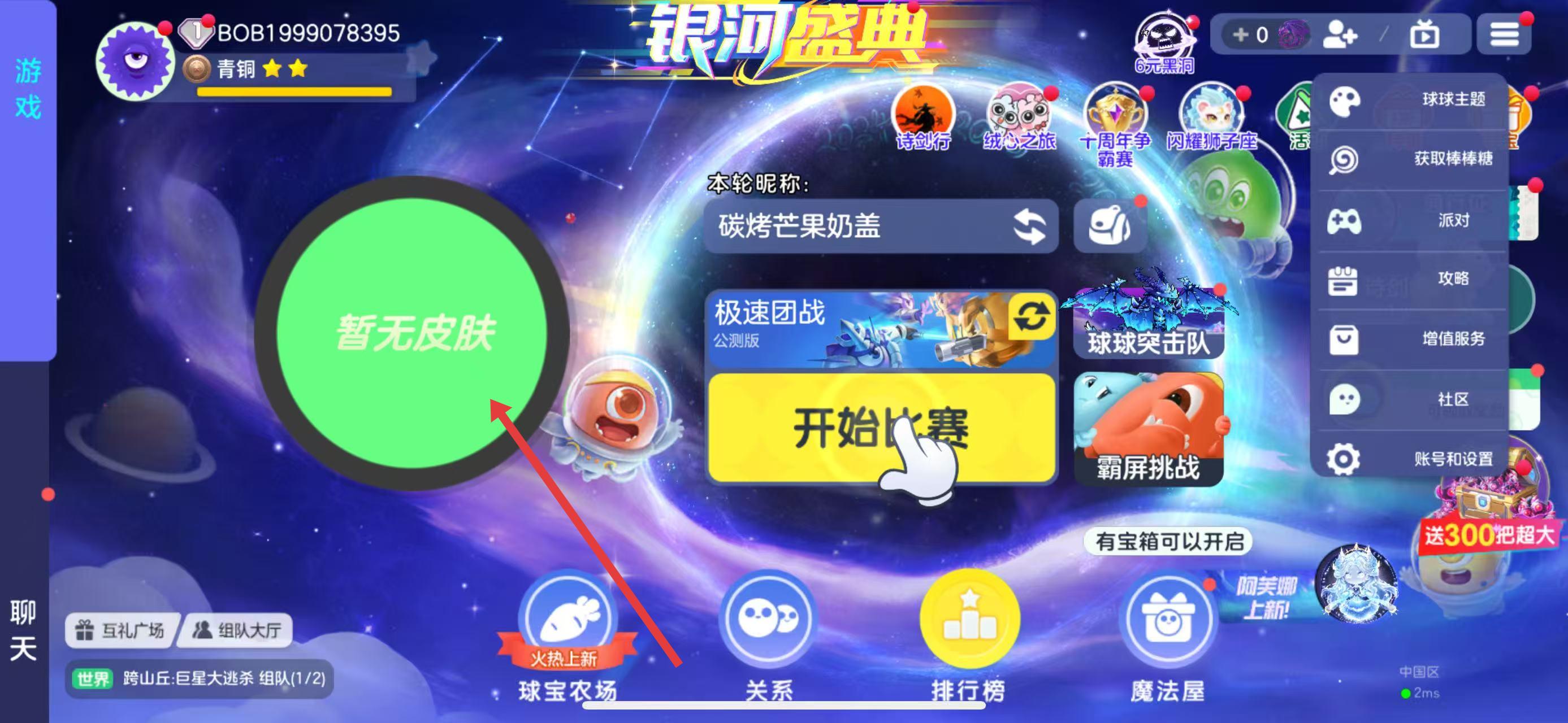 1、打开球球大作战进入主界面,点击中间暂无皮肤区域,即可进入皮肤选择相关界面,开启更换皮肤操作。