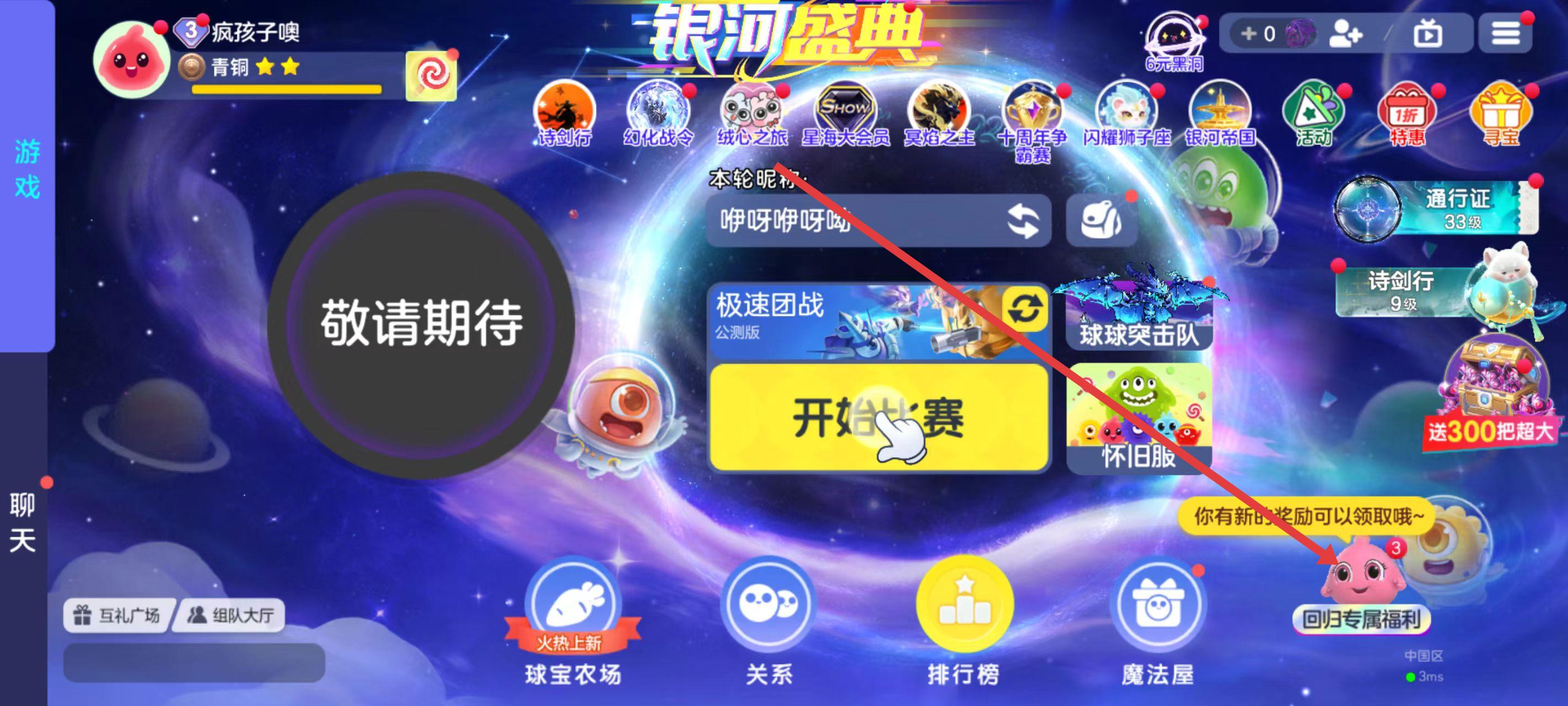 1、进入球球大作战游戏主界面,找到并点击右下角带有红点提示的回归专属福利按钮,进入回归福利活动页面。