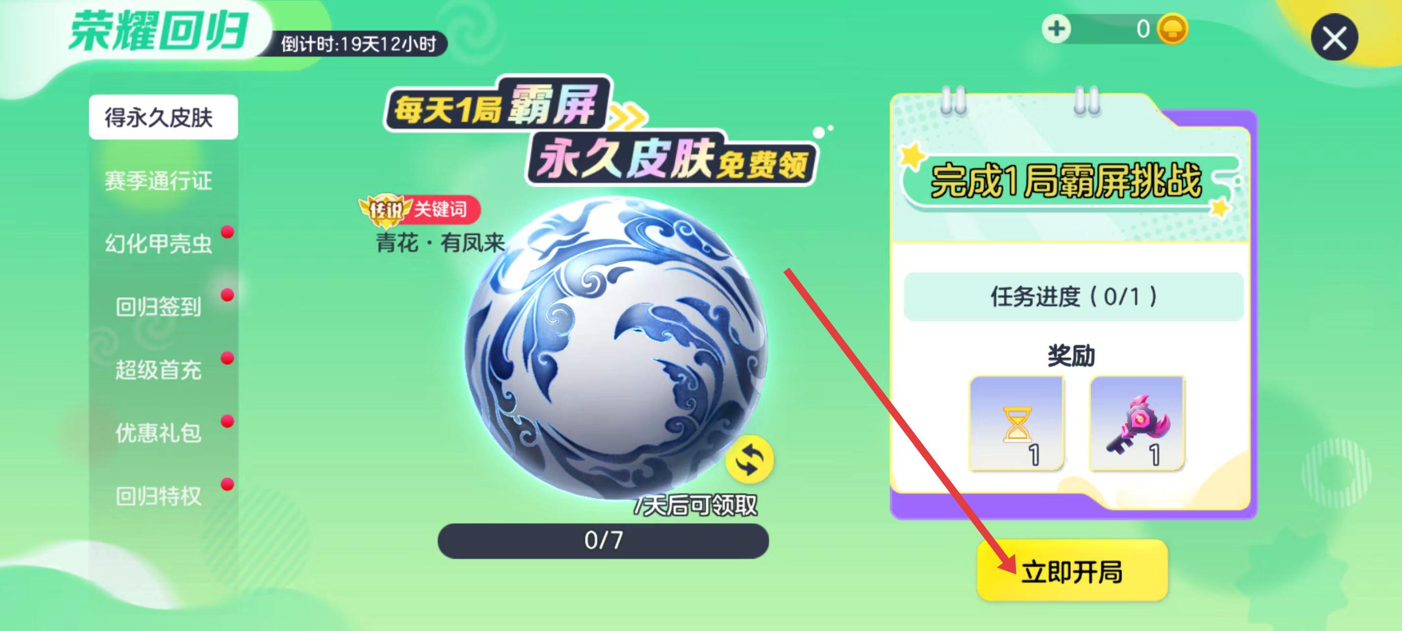 3、选中皮肤后,查看获取该皮肤的任务要求,比如完成1局霸屏挑战。点击立即开局参与相关游戏模式,完成任务后即可领取对应回归皮肤礼包。