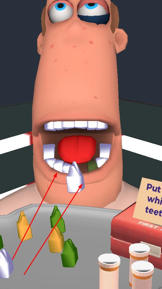 3、继续治疗流程,依据提示Put white teeth,将白色牙齿放置对应位置,修复角色牙齿。