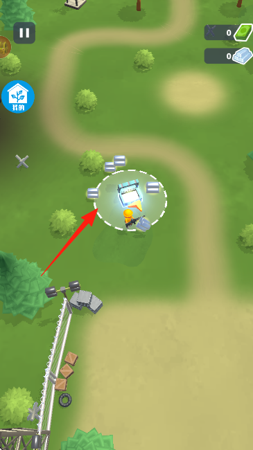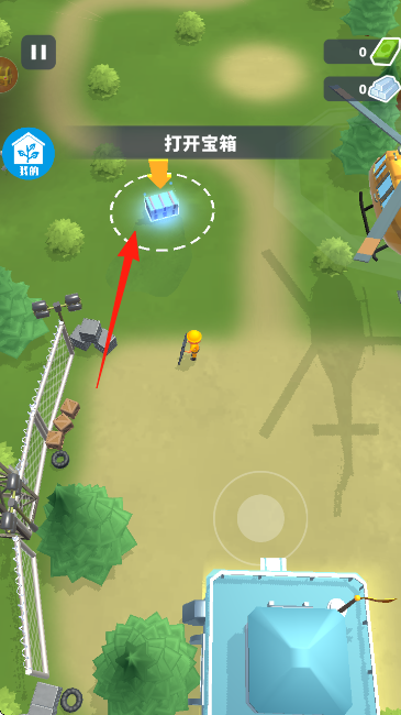 1、游戏开始,操控角色移动至【打开宝箱】提示位置红箭头所指,点击开启宝箱获取资源。