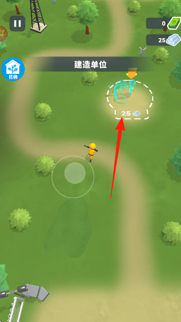 3、当资源达到建造要求如右上角显示的【25】,移动到【建造单位】标识处,点击进行单位建造推进进程。