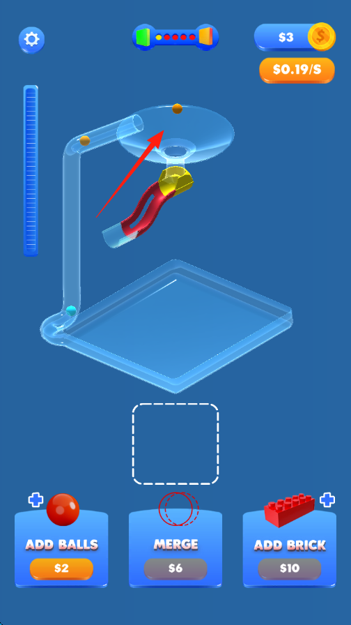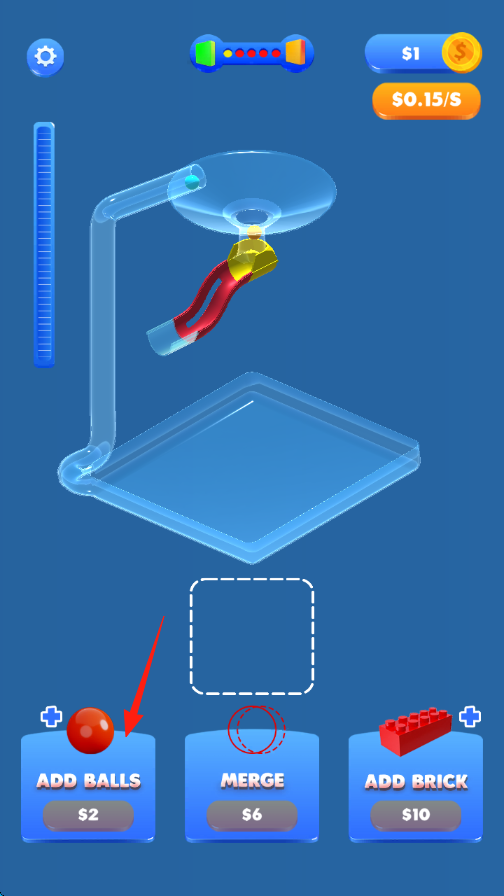 2、点击下方【ADDBALLS】花费$2,增加小球数量,让更多小球进入管道循环,提升产出。