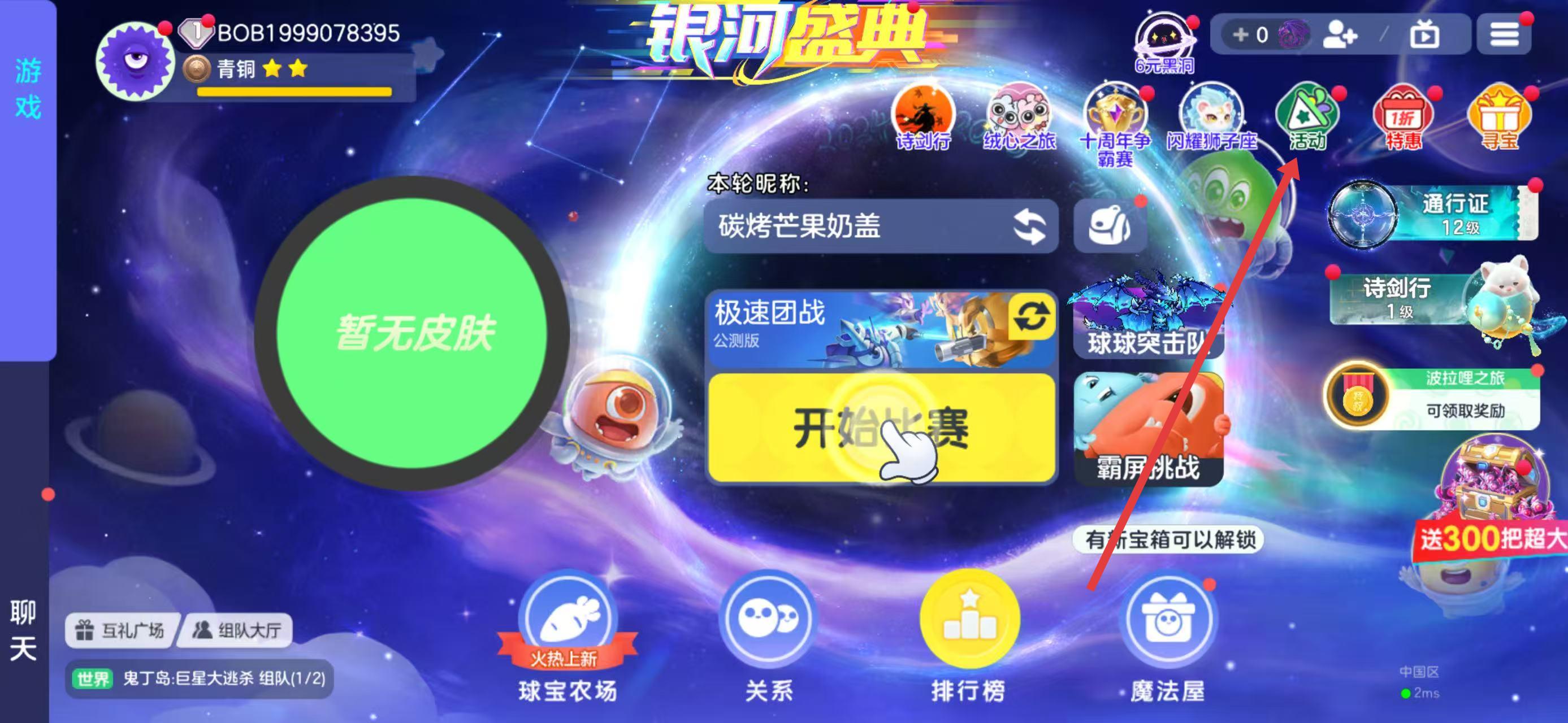 1、进入球球大作战主界面,点击右上方的活动图标,进入活动页面,这里集合了游戏当前正在进行的各类活动。