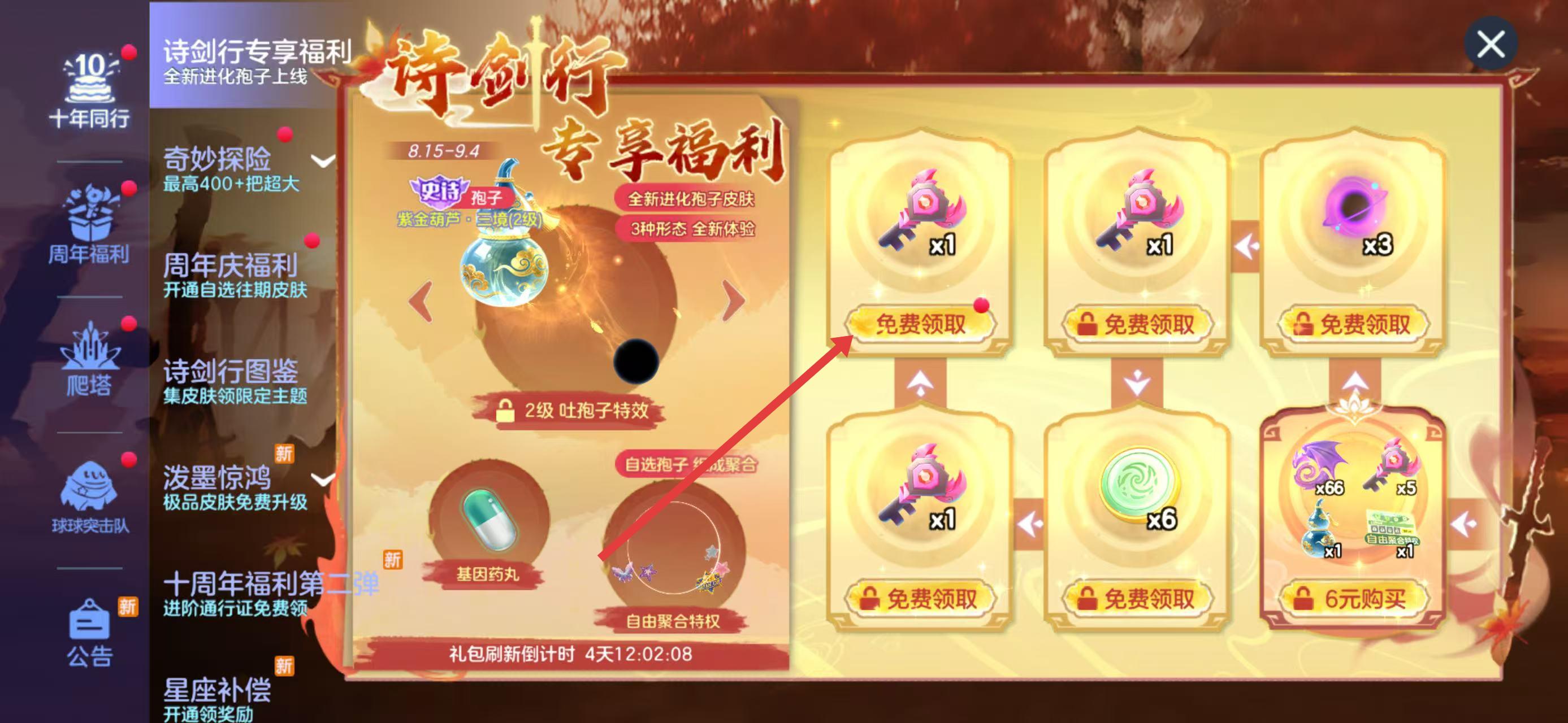 2、在活动页面中,找到并点击如诗剑行专享福利这类带有福利领取性质的活动选项。进入活动详情界面后,查看可领取的礼包内容,比如各种皮肤道具、钥匙等。