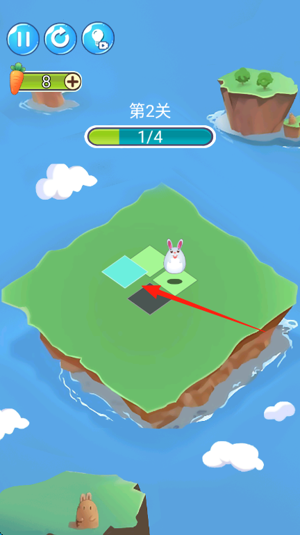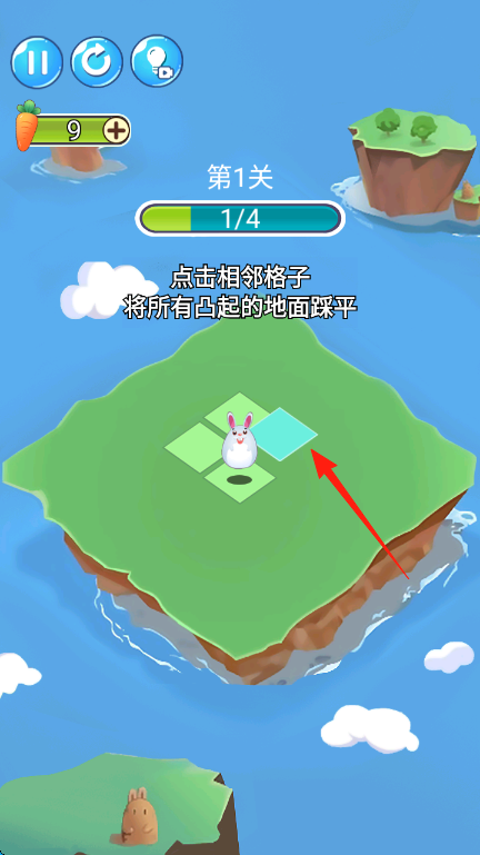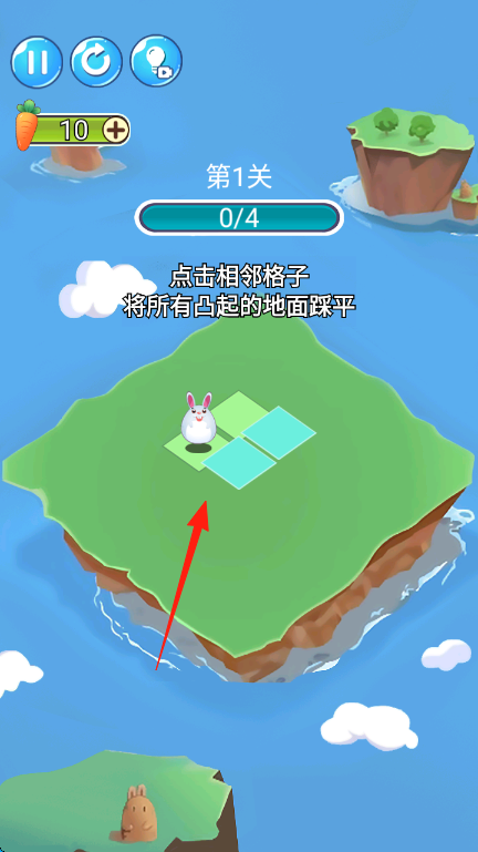 1、按提示【点击相邻格子将所有凸起的地面踩平】,点击兔子旁相邻格子,使其移动踩平,逐步完成4个凸起踩平目标。