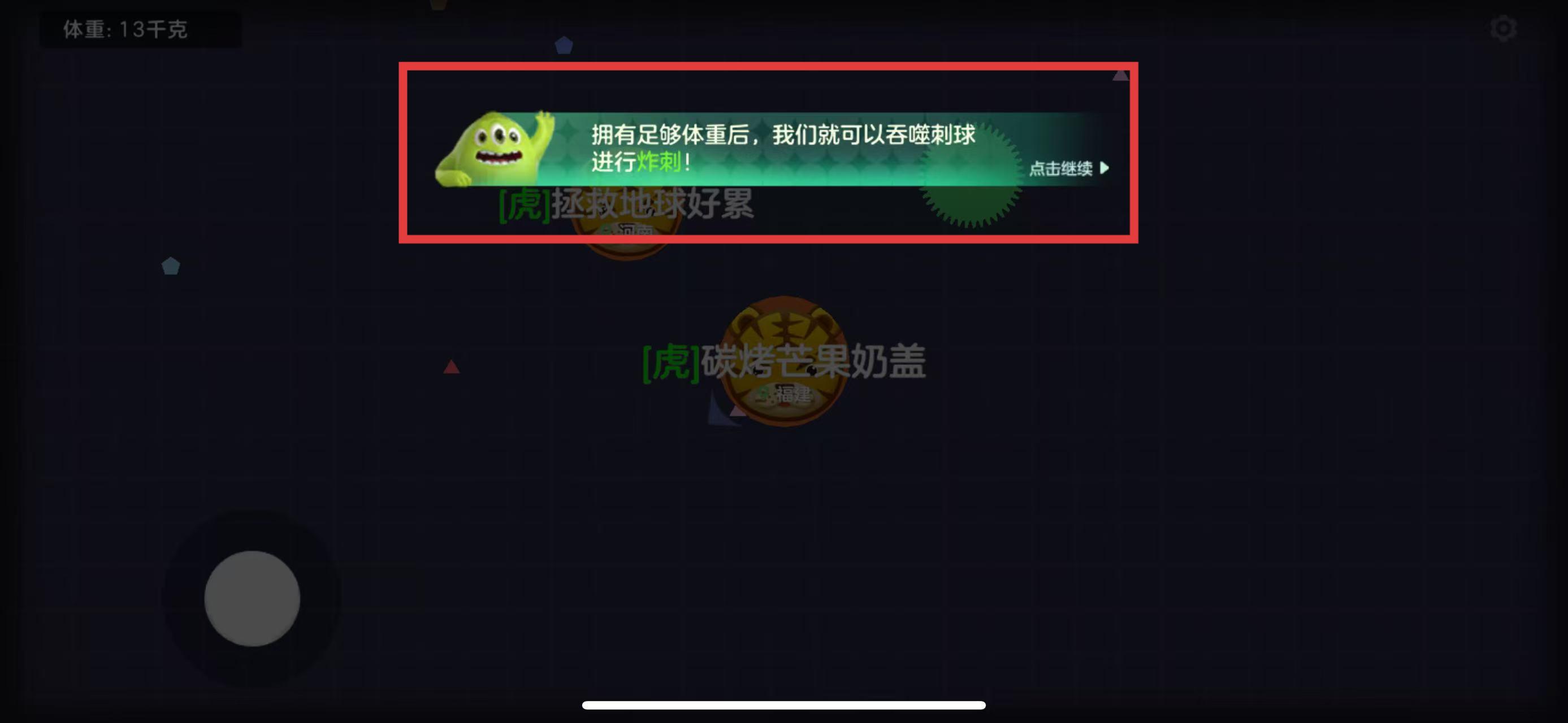 1、当体重达到13千克及以上时,控制球球移动,找到绿色刺球,靠近并吞噬它,完成炸刺操作,可获得成长助力。