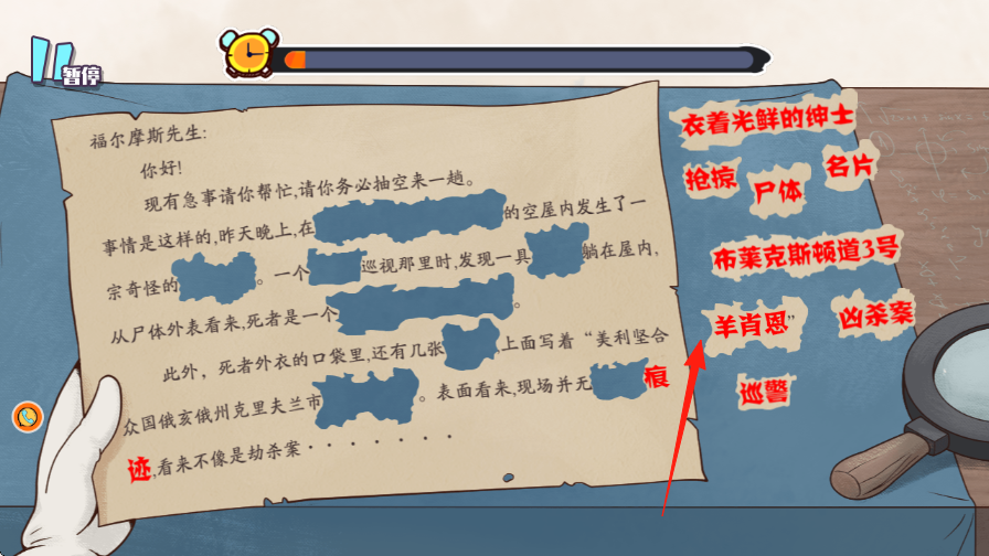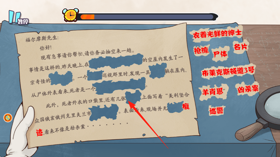 3、依次匹配词汇,完成信纸内容填充,梳理案件信息如空屋地点、发现者、死者物品等,辅助推理案件,像判断是否为劫杀案等,按此思路解开侦探推理挑战。