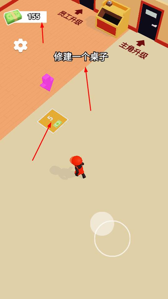 2、消耗货币修建设施,或升级员工、主角对应箭头指引。