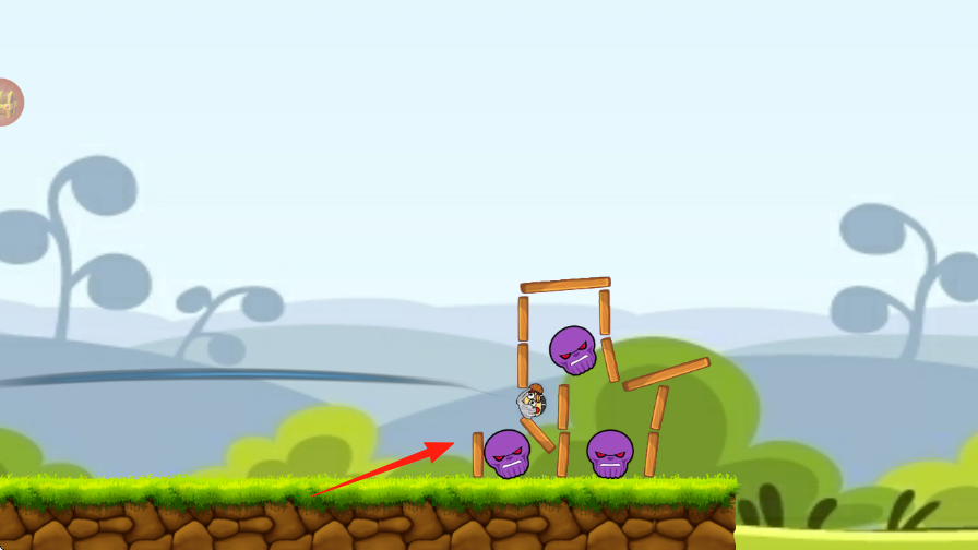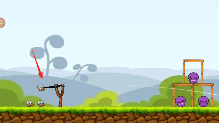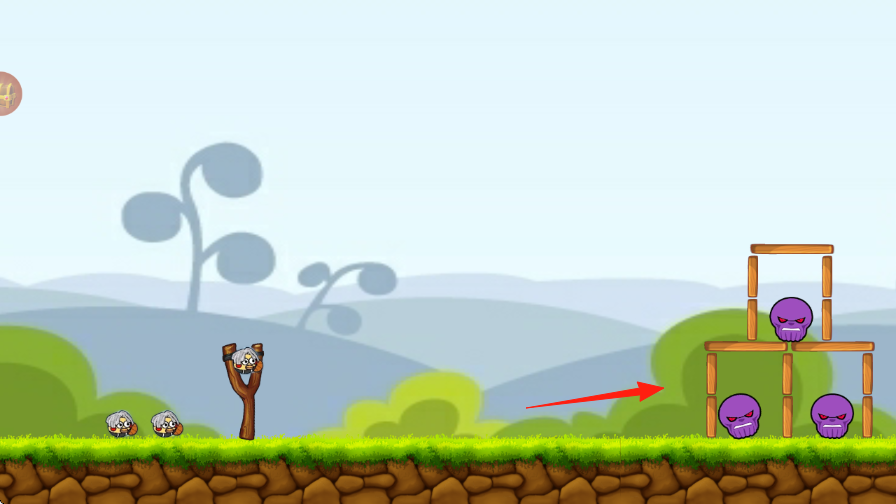 1、进入游戏后,观察到画面中有类似弹弓的装置,上面有角色,右侧有紫色敌人被木架保护着。
