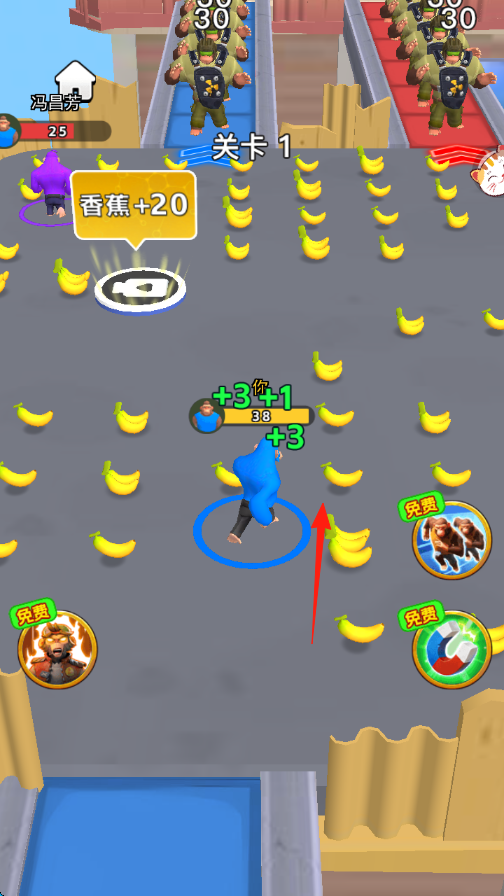 1、进入【关卡1】,操控蓝色角色在满是香蕉的区域移动,收集香蕉增加数量如【香蕉+20】。
