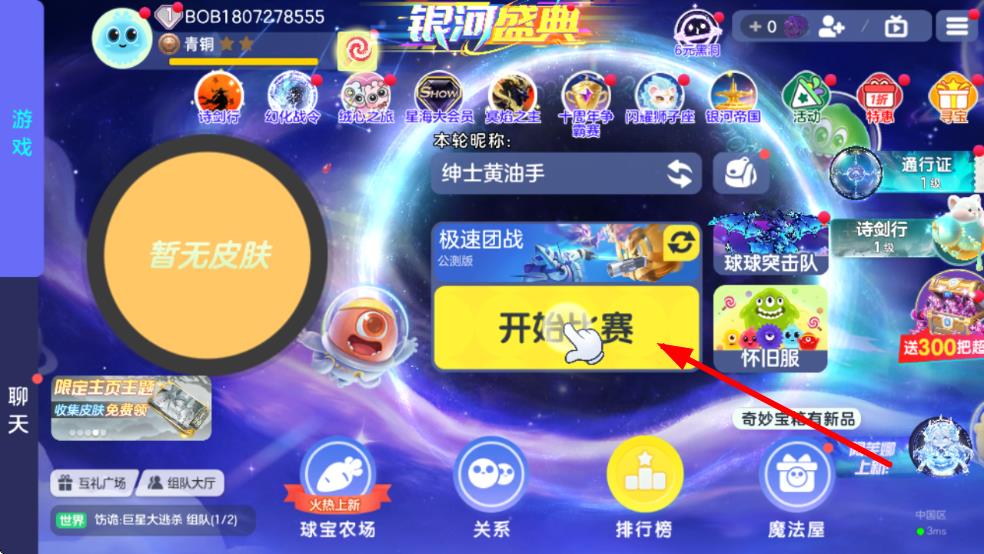 1、进入游戏主界面,点击开始比赛按钮,可选择单人参赛或组队参赛 ,若组队可点“+号邀请好友。