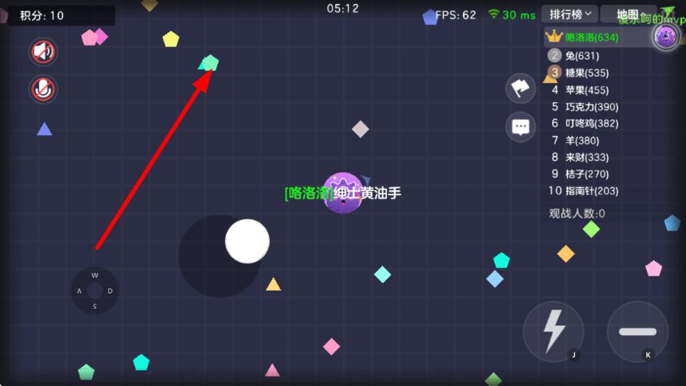 3、进入游戏后,通过移动摇杆控制球球移动,还可以通过吞噬比自己小的球球来快速变大,同时要注意躲避比自己大的球球,获取更高积分和名次。