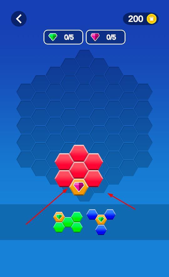 1、观察目标规划放置:进入关卡后,首先仔细观察界面中的目标形状,明确需要填充的区域和形态,然后根据手中的六边形方块颜色与形状,规划每一个方块的放置位置。