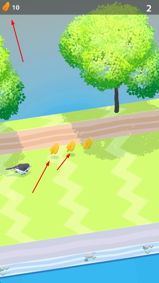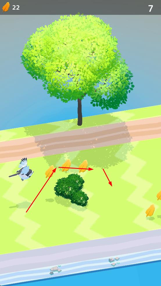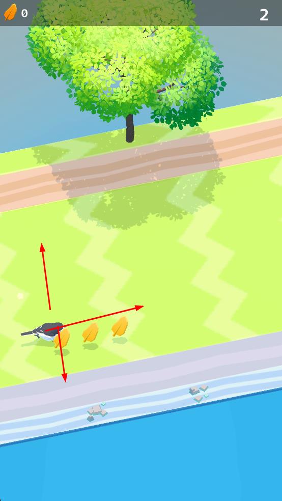 1、操控小鸟在场景移动,收集黄色羽毛,提升左上角羽毛计数。