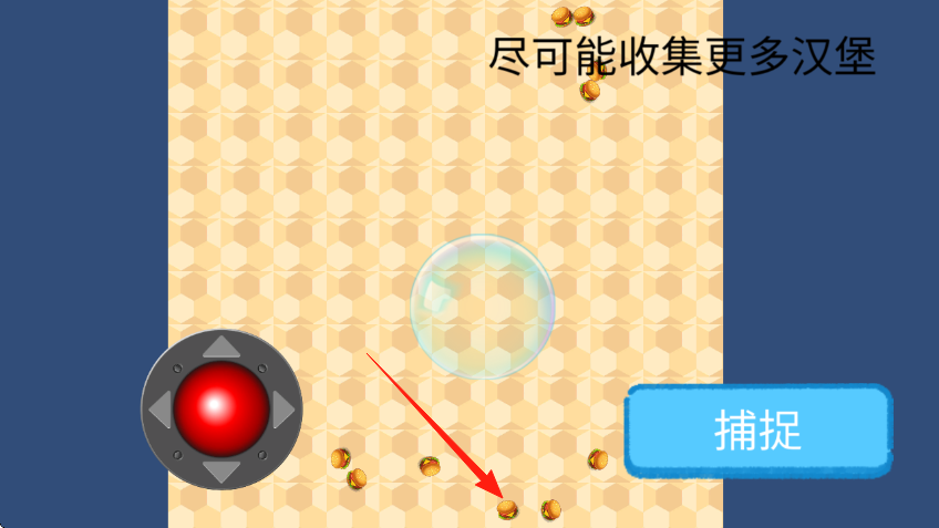 2、操控气泡在场景中移动,收集散落的汉堡红箭头所指,提升收集数量。