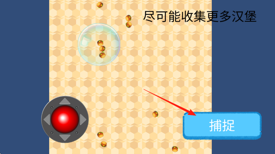 1、游戏开始,通过屏幕左下角的操纵杆红箭头所指控制气泡移动,按提示尽可能收集更多汉堡行动。