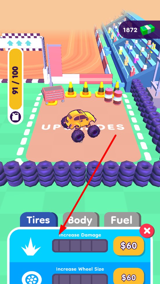 1、进入游戏,操控巨型车在障碍赛道行驶,长按屏幕加速,压碎车辆,观察燃油条,归零后,车辆前进速度变慢。