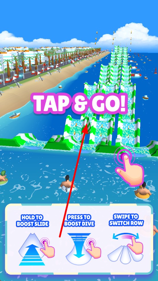 1、主界面点击TAP&GO启动游戏,可选初始泳圈角色,长按加速、点击潜水、滑动换道的操作提示,熟悉操作逻辑。