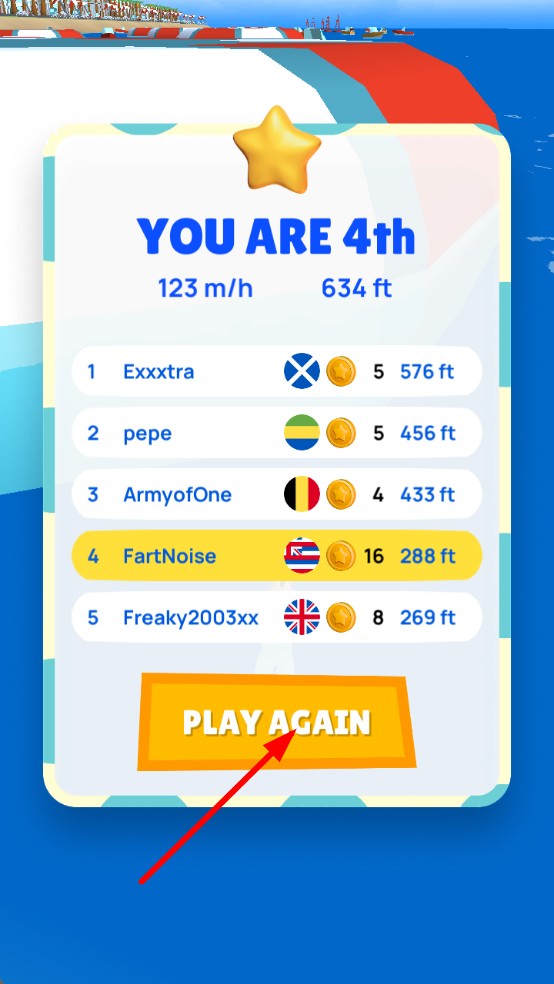3、冲过终点后结算界面显示排名、最高速度与滑行距离,点击PLAY AGAIN立即重开,提升游玩技巧。