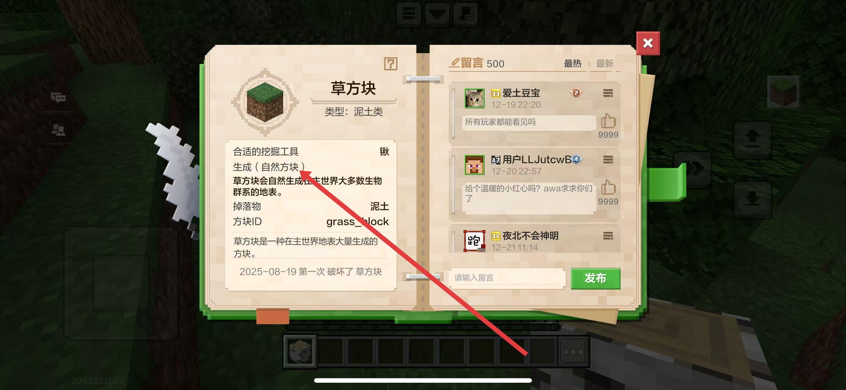 3、破坏草方块后,打开物品百科,查看草方块信息,可知其为泥土类、合适挖掘工具是锹,了解生成与掉落等详情。