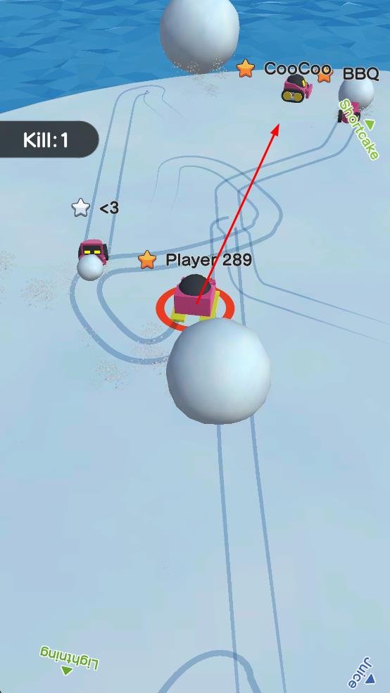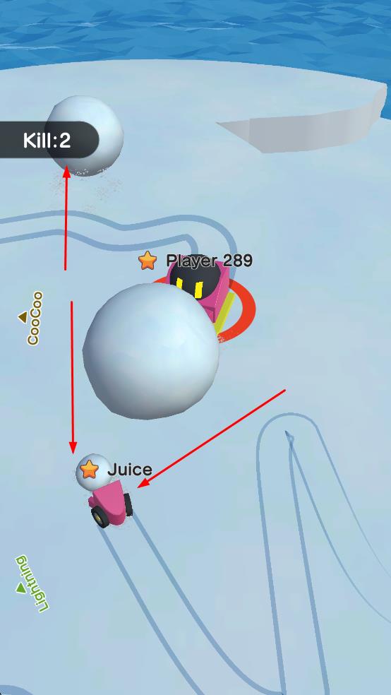 1、操控粉色小车在雪地移动,推动雪球,瞄准其他玩家撞击,开启淘汰进程。