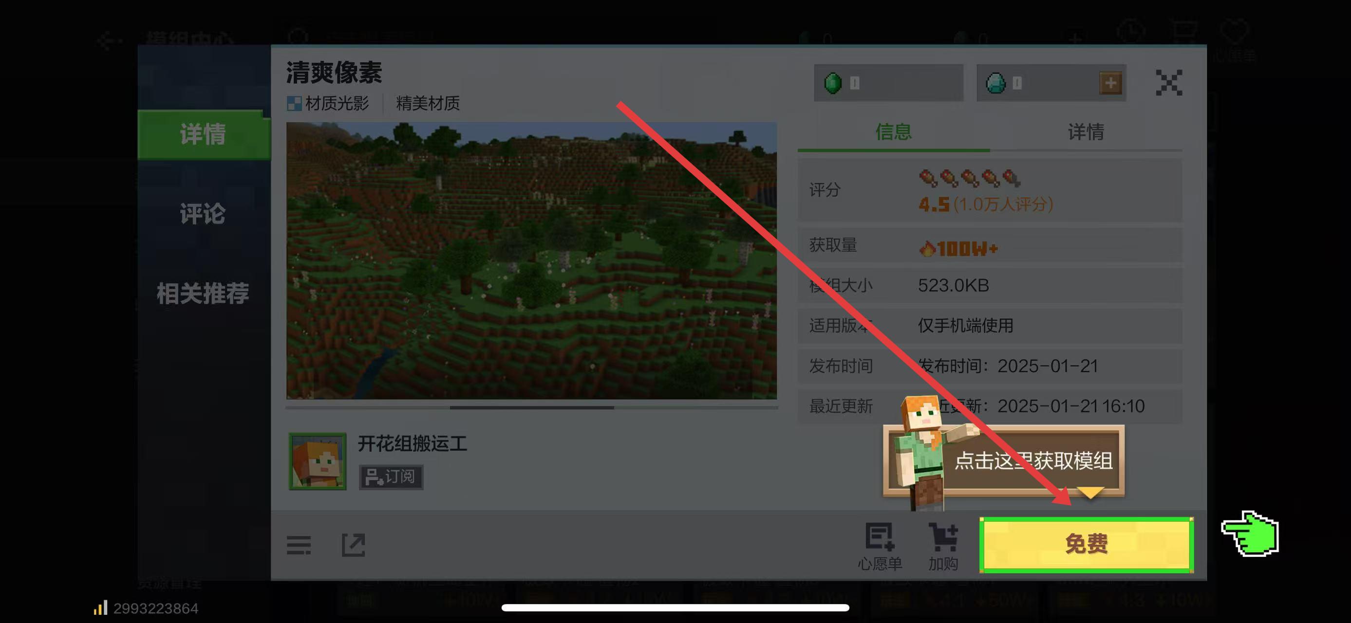1、进入“清爽像素”模组详情页,点击右下角免费按钮,获取该材质模组。