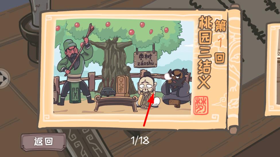 1、进入游戏后选择关卡,查看当前三国典故场景,如桃园中刘备、关羽、张飞的互动画面,点击场景中的物品或人物触发线索,开始解谜。