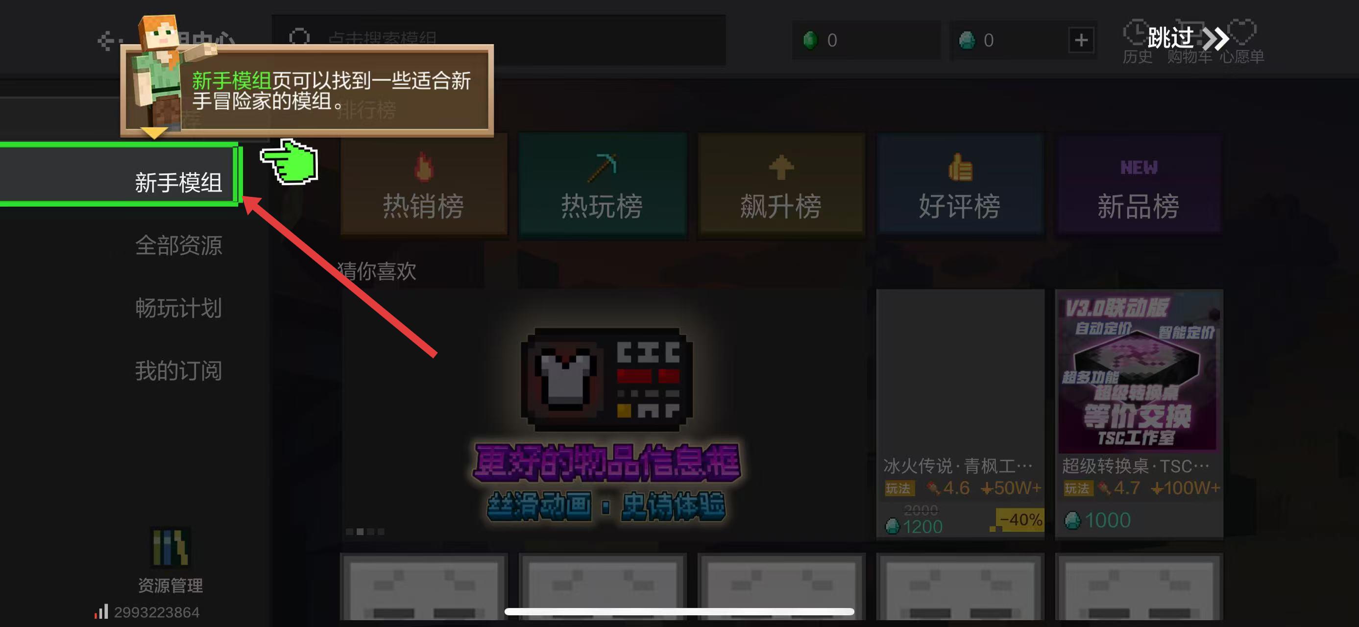 3、进入新手模组界面,浏览“萌新必备模组”列表,像清爽像素等模组,点击模组封面可看介绍,按需下载体验新内容。