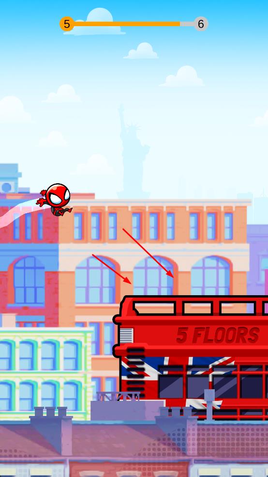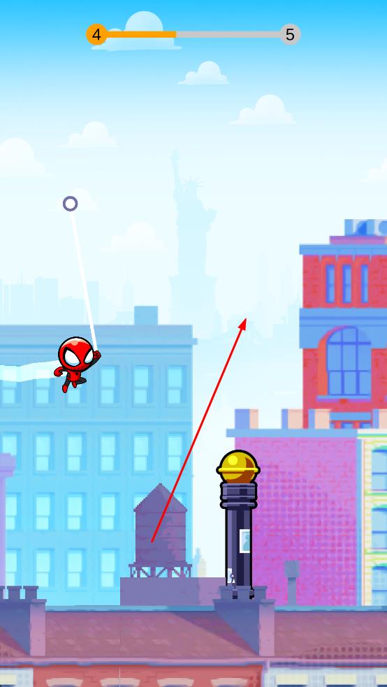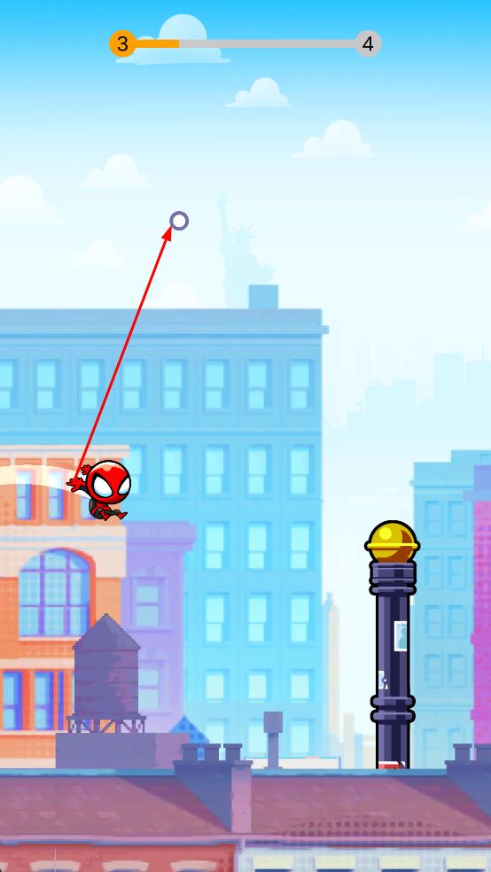 1、操控绳索精准跳跃:玩家通过简单操作控制蜘蛛侠甩出绳索,瞄准前方合适的落点后释放绳索完成跳跃,需根据前方障碍物与平台距离调整跳跃力度与时机,确保顺利前进不落地。