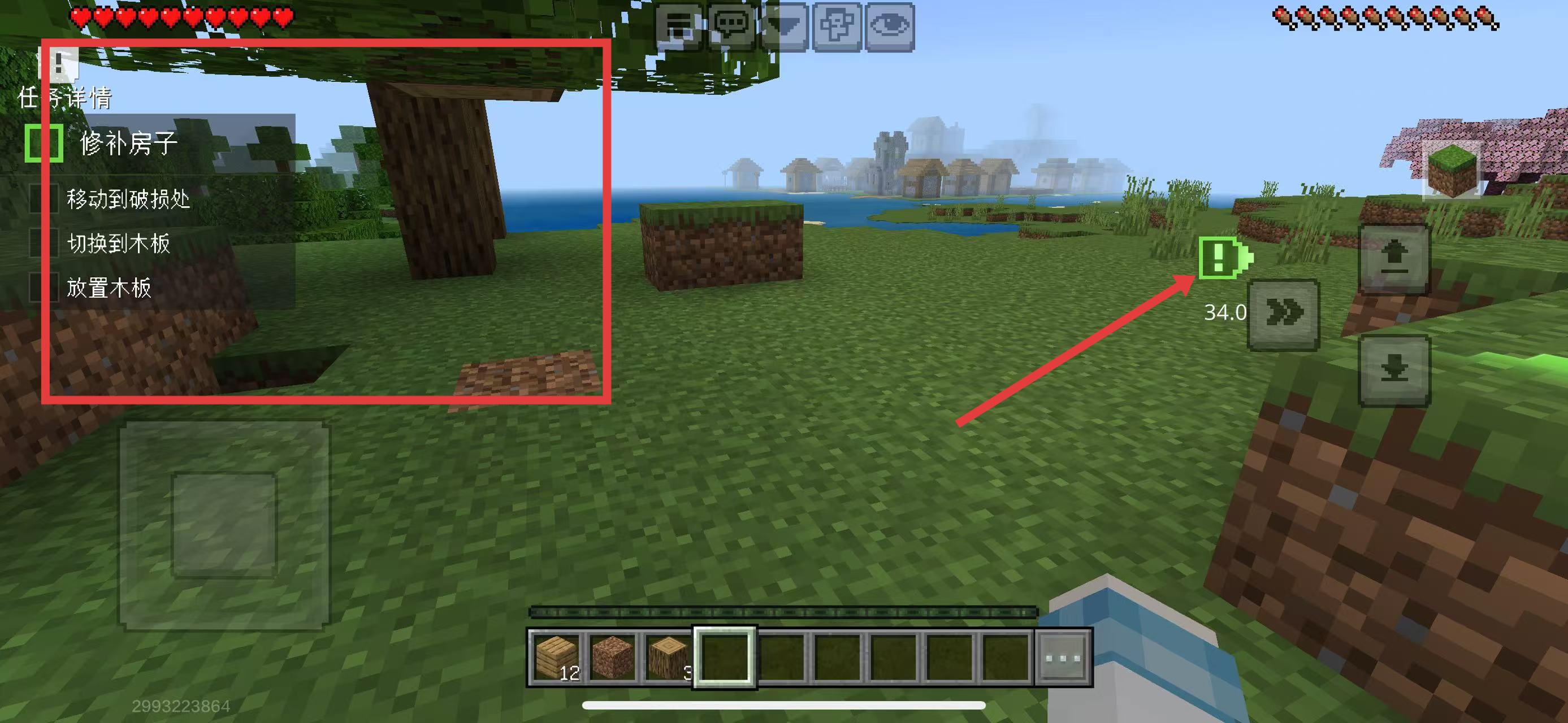 1、接取修补房子任务,按指引朝绿色感叹号方向移动,抵达房子破损处。