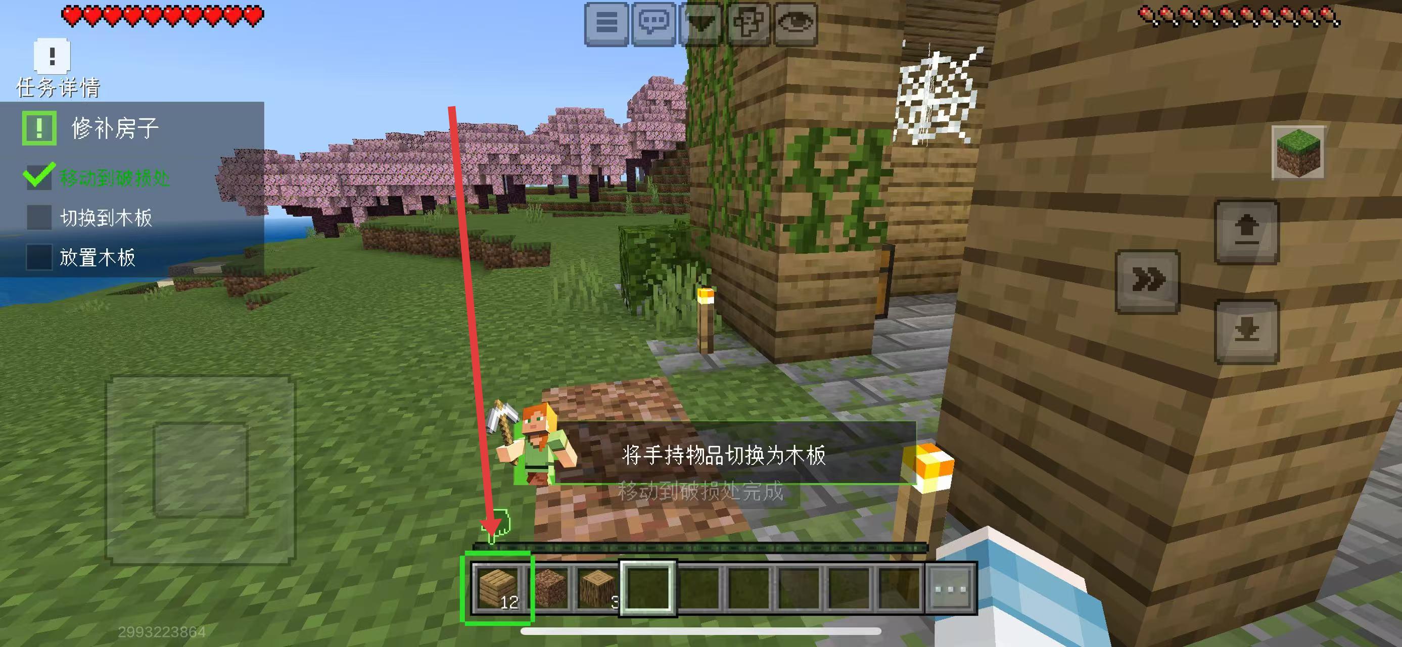 2、到达破损处后,点击下方木板图标,将手持物品切换为木板,准备修补。