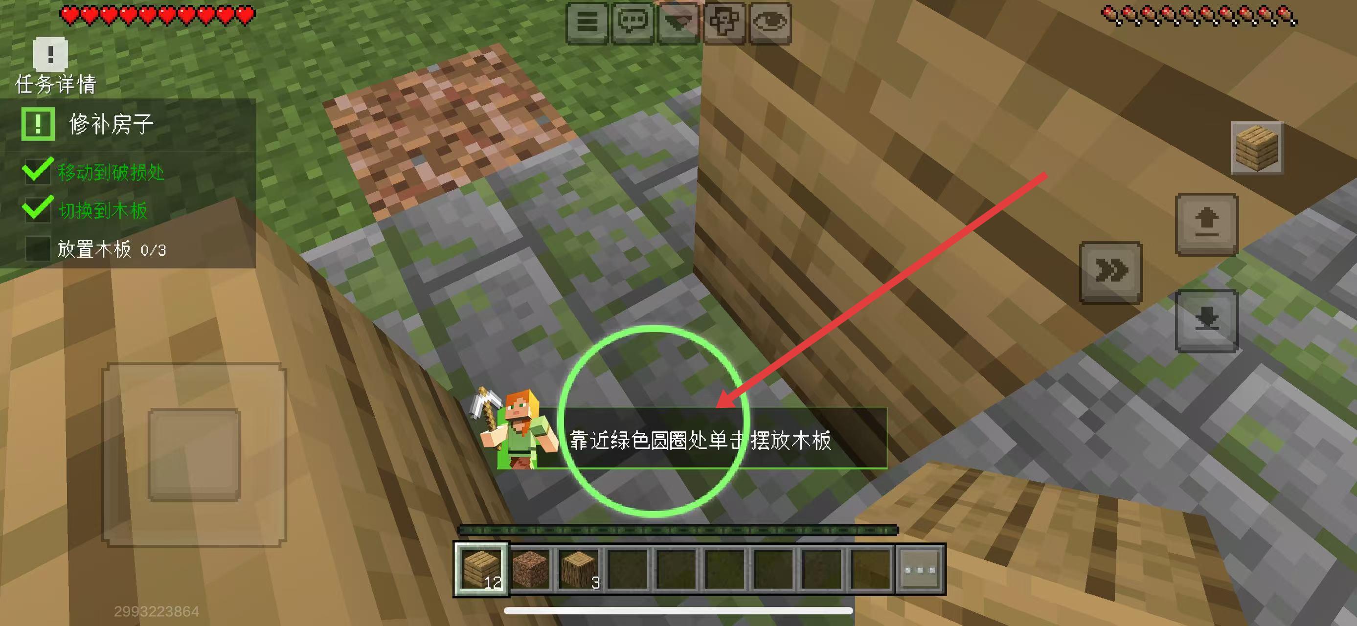 3、靠近绿色圆圈区域,点击屏幕摆放木板,完成3次放置,即可修好房子。