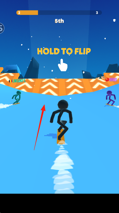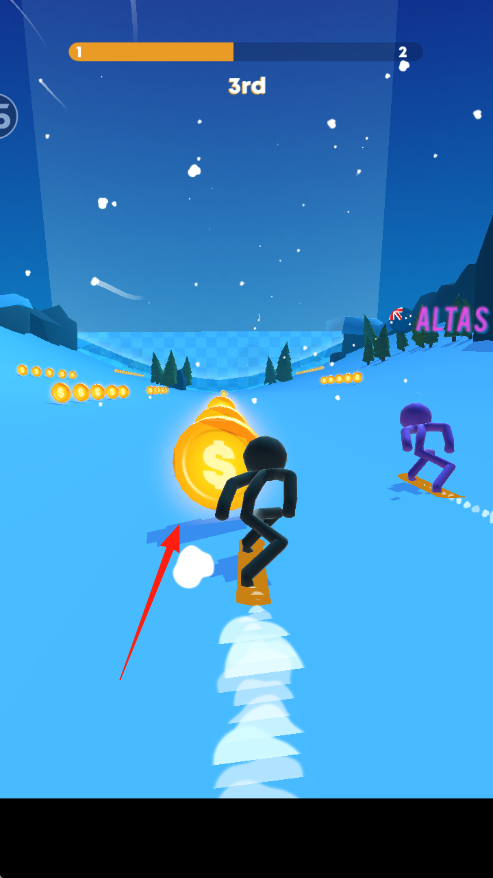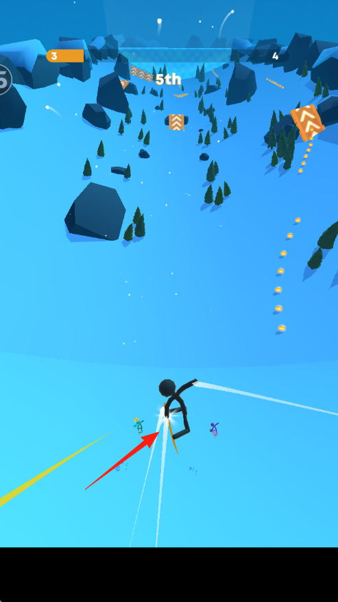1、游戏开始后,操控火柴人在雪地上滑行,按红箭头方向收集金币,提升分数,同时留意上方排名显示,如3rd,5th。