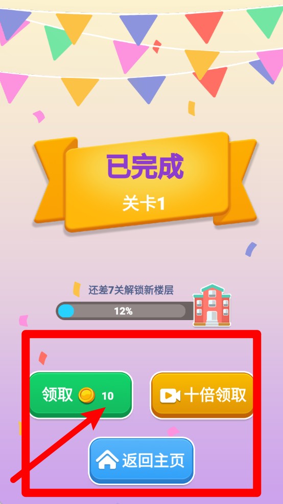 3.完成关卡后系统会提示玩家通关情况,可以选择直接领取金币或者观看视频十倍领取,增加闯关的奖励收益。