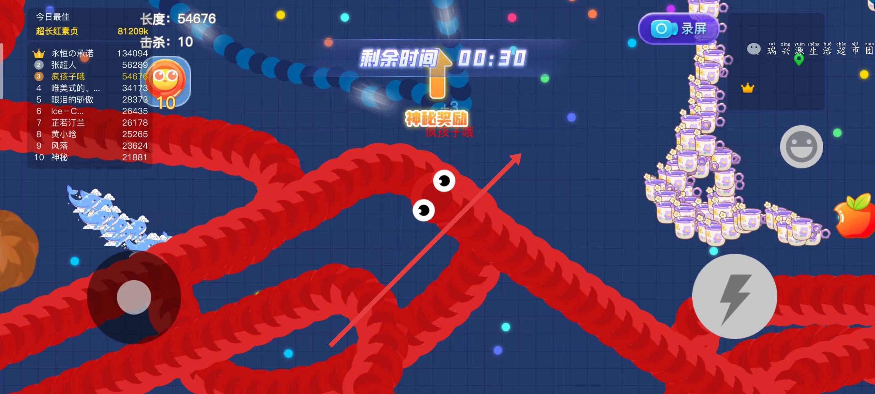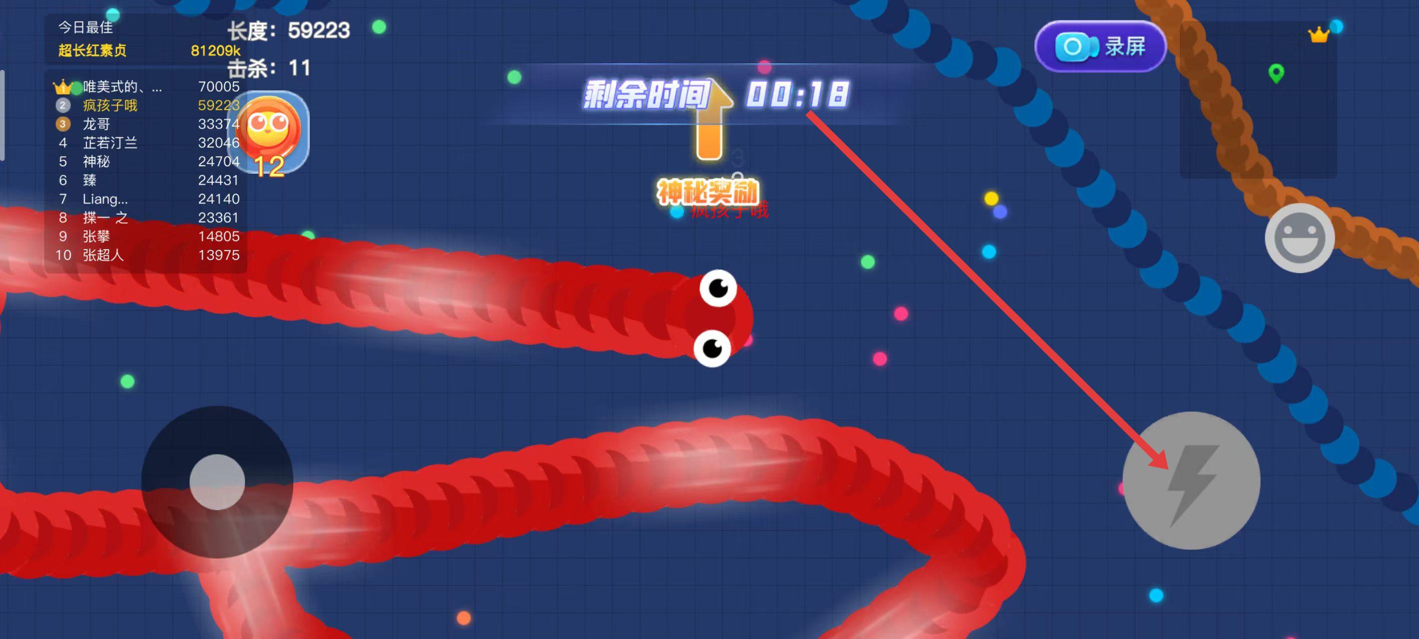 3.长按加速键,用巧妙的走位让蛇身被别人撞上,就可以吃掉尸体迅速变长。