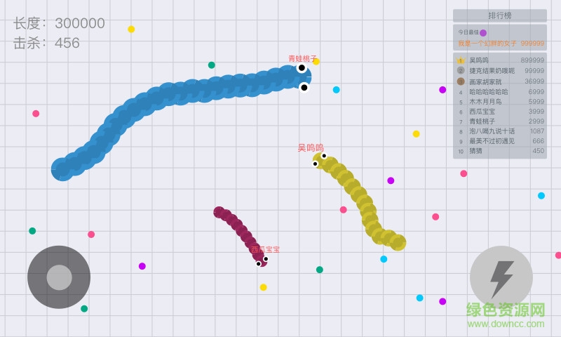 1.控制摇杆走位你的小蛇,吃掉地图上彩色的小圆点,就会变长。