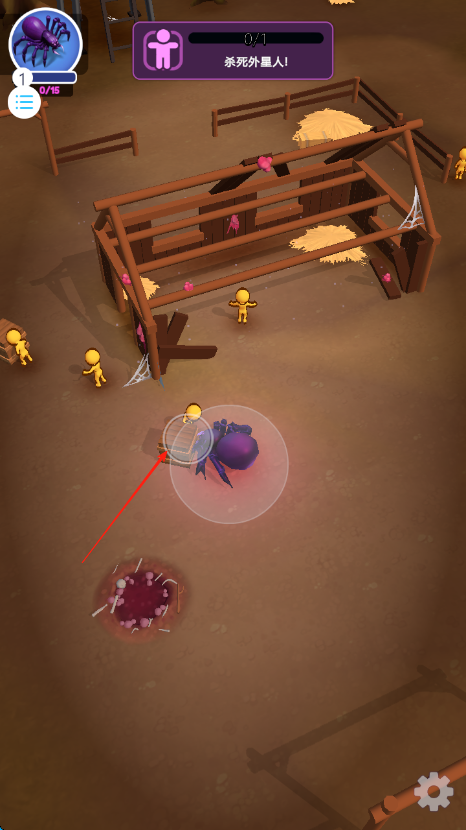 1、进入游戏界面,明确任务【杀死外星人】,操控紫色蜘蛛靠近黄色外星人,利用攻击机制消灭敌人。