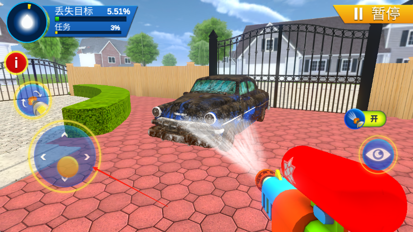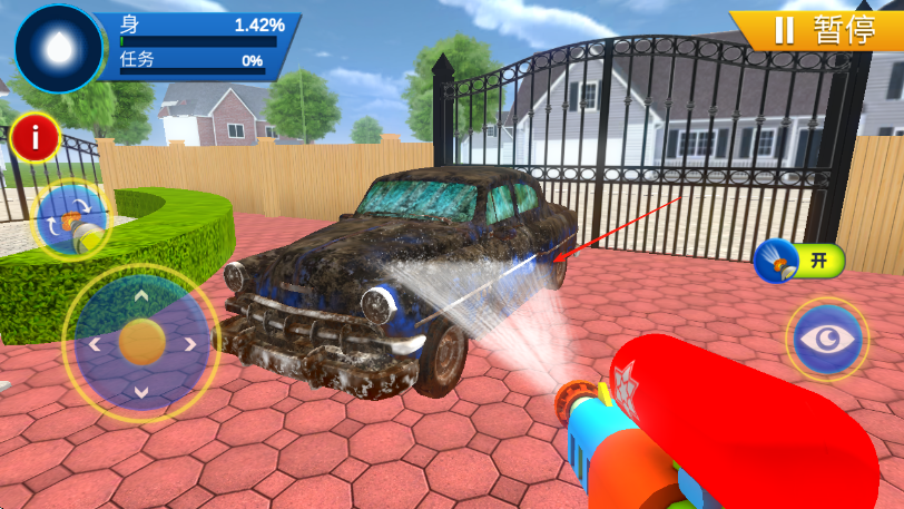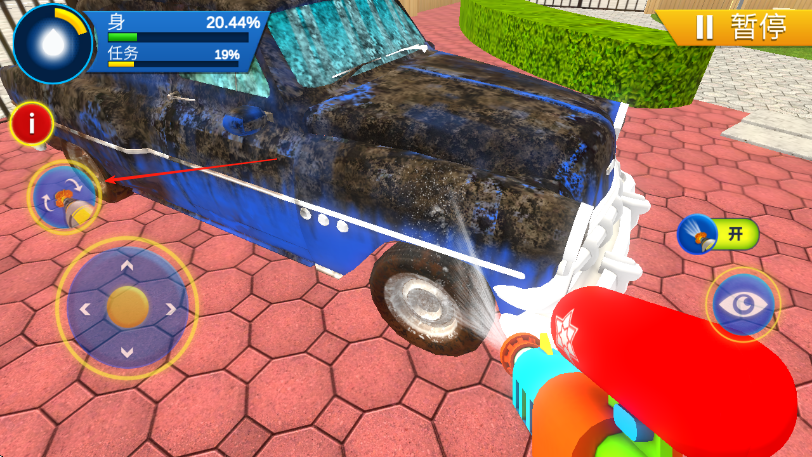 2、点击类似开的按钮启动喷水装置,对准汽车进行冲洗,通过左下角虚拟摇杆控制角色移动,留意屏幕上方【任务】进度条变化。
